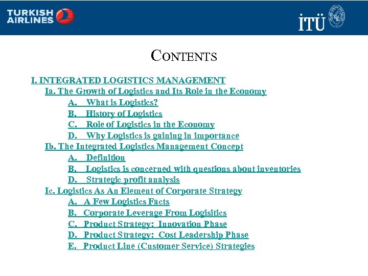 CONTENTS I. INTEGRATED LOGISTICS MANAGEMENT Ia. The Growth of Logistics and Its Role in the Economy A. What is Logistics? B. History of Logistics C. Role of Logistics in the Economy D. Why Logistics is gaining in importance Ib. The Integrated Logistics Management Concept A. Definition B. Logistics is concerned with questions about inventories D. Strategic profit analysis Ic. Logistics As An Element of Corporate Strategy A. A Few Logistics Facts B. Corporate Leverage From Logisitics C. Product Strategy: Innovation Phase D. Product Strategy: Cost Leadership Phase E. Product Line (Customer Service) Strategies