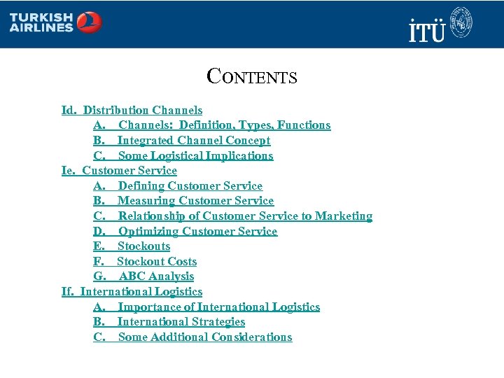 CONTENTS Id. Distribution Channels A. Channels: Definition, Types, Functions B. Integrated Channel Concept C. Some Logistical Implications Ie. Customer Service A. Defining Customer Service B. Measuring Customer Service C. Relationship of Customer Service to Marketing D. Optimizing Customer Service E. Stockouts F. Stockout Costs G. ABC Analysis If. International Logistics A. Importance of International Logistics B. International Strategies C. Some Additional Considerations