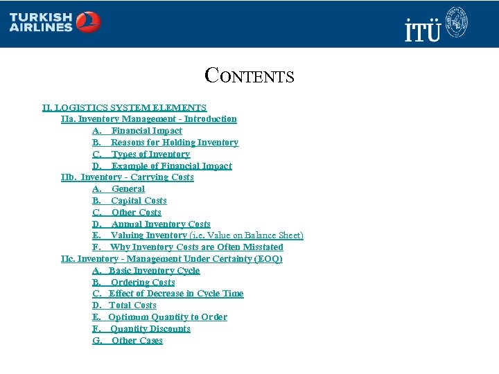 CONTENTS II. LOGISTICS SYSTEM ELEMENTS IIa. Inventory Management ‑ Introduction A. Financial Impact B. Reasons for Holding Inventory C. Types of Inventory D. Example of Financial Impact IIb. Inventory ‑ Carrying Costs A. General B. Capital Costs C. Other Costs D. Annual Inventory Costs E. Valuing Inventory (i. e. Value on Balance Sheet) F. Why Inventory Costs are Often Misstated IIc. Inventory ‑ Management Under Certainty (EOQ) A. Basic Inventory Cycle B. Ordering Costs C. Effect of Decrease in Cycle Time D. Total Costs E. Optimum Quantity to Order F. Quantity Discounts G. Other Cases