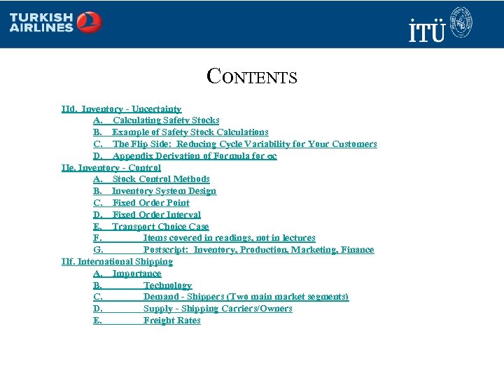 CONTENTS IId. Inventory ‑ Uncertainty A. Calculating Safety Stocks B. Example of Safety Stock Calculations C. The Flip Side: Reducing Cycle Variability for Your Customers D. Appendix Derivation of Formula for σc IIe. Inventory ‑ Control A. Stock Control Methods B. Inventory System Design C. Fixed Order Point D. Fixed Order Interval E. Transport Choice Case F. Items covered in readings, not in lectures G. Postscript: Inventory, Production, Marketing, Finance IIf. International Shipping A. Importance B. Technology C. Demand - Shippers (Two main market segments) D. Supply - Shipping Carriers/Owners E. Freight Rates