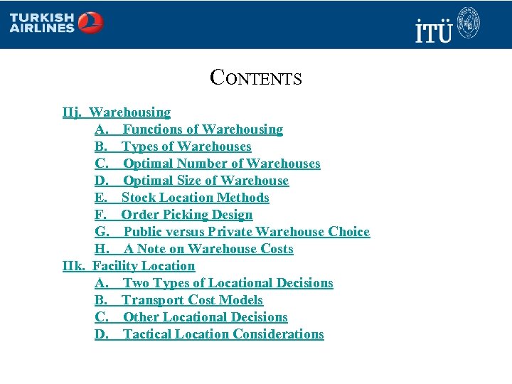CONTENTS IIj. Warehousing A. Functions of Warehousing B. Types of Warehouses C. Optimal Number of Warehouses D. Optimal Size of Warehouse E. Stock Location Methods F. Order Picking Design G. Public versus Private Warehouse Choice H. A Note on Warehouse Costs IIk. Facility Location A. Two Types of Locational Decisions B. Transport Cost Models C. Other Locational Decisions D. Tactical Location Considerations