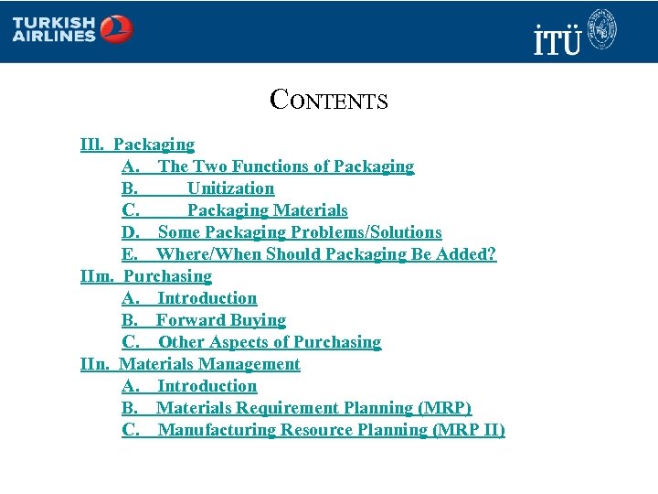 CONTENTS IIl. Packaging A. The Two Functions of Packaging B. Unitization C. Packaging Materials D. Some Packaging Problems/Solutions E. Where/When Should Packaging Be Added? IIm. Purchasing A. Introduction B. Forward Buying C. Other Aspects of Purchasing IIn. Materials Management A. Introduction B. Materials Requirement Planning (MRP) C. Manufacturing Resource Planning (MRP II)