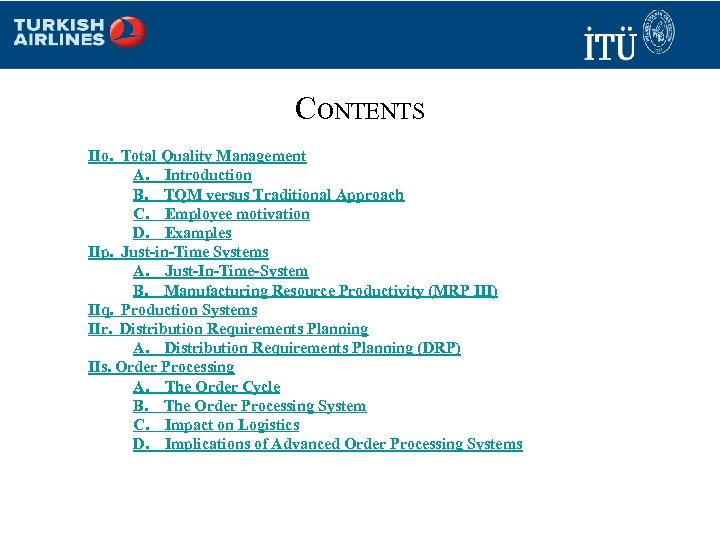 CONTENTS IIo. Total Quality Management A. Introduction B. TQM versus Traditional Approach C. Employee motivation D. Examples IIp. Just-in-Time Systems A. Just-In-Time-System B. Manufacturing Resource Productivity (MRP III) IIq. Production Systems IIr. Distribution Requirements Planning A. Distribution Requirements Planning (DRP) IIs. Order Processing A. The Order Cycle B. The Order Processing System C. Impact on Logistics D. Implications of Advanced Order Processing Systems