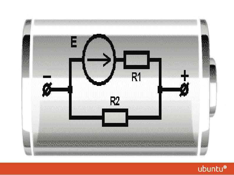 Знаками "+" и "-" на Рисунке обозначены наружние контакты реального источника тока, например, клеммы батарейки. Буквой "E" обозначен идеальный (теоретический) источник тока. Сопротивление R 1 соединёно последовательно с источником тока, R 2 - параллельно источнику.