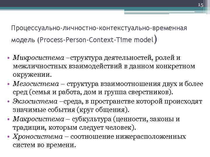 15 Процессуально-личностно-контекстуально-временная модель (Process-Person-Context-Time model) • Микросистема –структура деятельностей, ролей и межличностных взаимодействий в данном конкретном окружении. • Мезосистема – структура взаимоотношения двух и более сред (семья и работа, дом и группа сверстников). • Экзосистема –среда, в пространстве которой происходят значимые события (круг общения). • Макросистема – субкультура (ценности, законы и традиции, которым следует человек). • Хроносистема – соотношение нижерасположенных систем во времени.