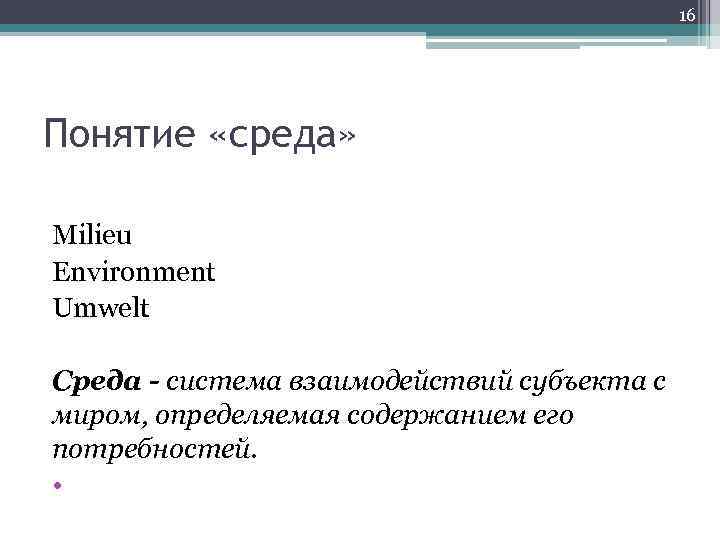 16 Понятие «среда» Milieu Environment Umwelt Среда - система взаимодействий субъекта с миром, определяемая содержанием его потребностей. •