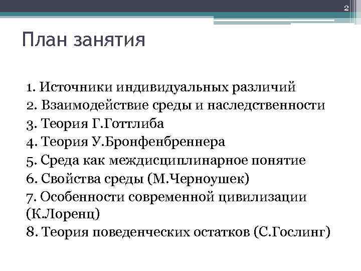 2 План занятия 1. Источники индивидуальных различий 2. Взаимодействие среды и наследственности 3. Теория Г. Готтлиба 4. Теория У. Бронфенбреннера 5. Среда как междисциплинарное понятие 6. Свойства среды (М. Черноушек) 7. Особенности современной цивилизации (К. Лоренц) 8. Теория поведенческих остатков (С. Гослинг)