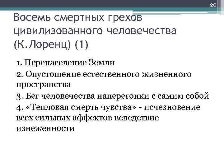 20 Восемь смертных грехов цивилизованного человечества (К. Лоренц) (1) 1. Перенаселение Земли 2. Опустошение естественного жизненного пространства 3. Бег человечества наперегонки с самим собой 4. «Тепловая смерть чувства» - исчезновение всех сильных аффектов вследствие изнеженности