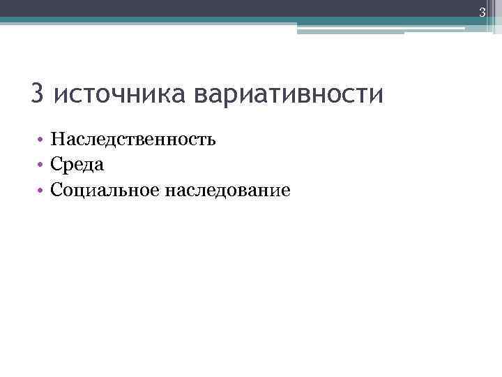 3 3 источника вариативности • Наследственность • Среда • Социальное наследование