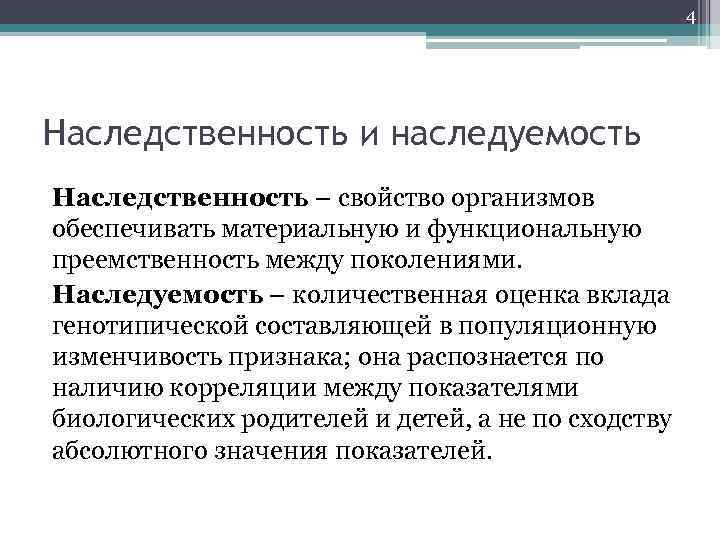 4 Наследственность и наследуемость Наследственность – свойство организмов обеспечивать материальную и функциональную преемственность между поколениями. Наследуемость – количественная оценка вклада генотипической составляющей в популяционную изменчивость признака; она распознается по наличию корреляции между показателями биологических родителей и детей, а не по сходству абсолютного значения показателей.