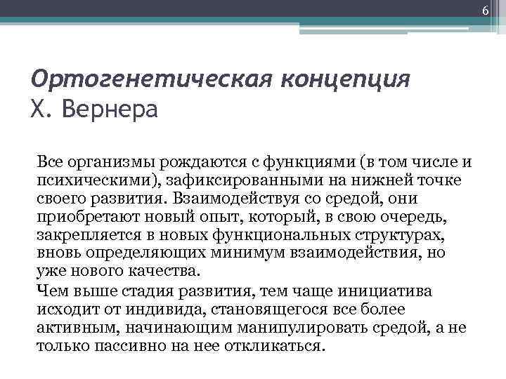 6 Ортогенетическая концепция Х. Вернера Все организмы рождаются с функциями (в том числе и психическими), зафиксированными на нижней точке своего развития. Взаимодействуя со средой, они приобретают новый опыт, который, в свою очередь, закрепляется в новых функциональных структурах, вновь определяющих минимум взаимодействия, но уже нового качества. Чем выше стадия развития, тем чаще инициатива исходит от индивида, становящегося все более активным, начинающим манипулировать средой, а не только пассивно на нее откликаться.