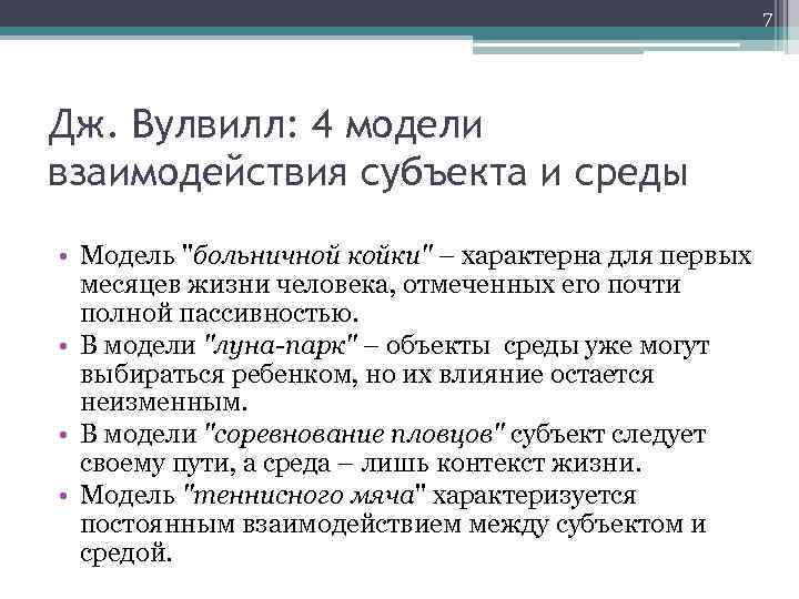7 Дж. Вулвилл: 4 модели взаимодействия субъекта и среды • Модель "больничной койки" – характерна для первых месяцев жизни человека, отмеченных его почти полной пассивностью. • В модели "луна-парк" – объекты среды уже могут выбираться ребенком, но их влияние остается неизменным. • В модели "соревнование пловцов" субъект следует своему пути, а среда – лишь контекст жизни. • Модель "теннисного мяча" характеризуется постоянным взаимодействием между субъектом и средой.