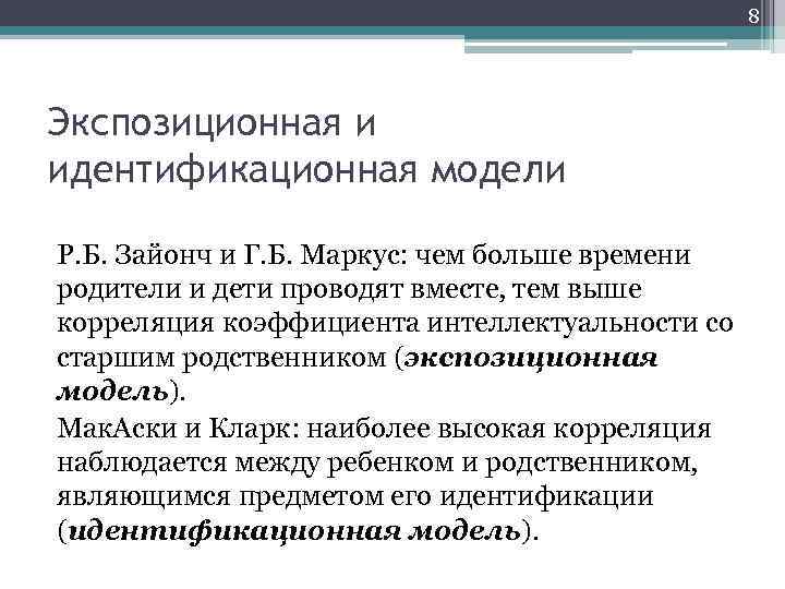 8 Экспозиционная и идентификационная модели Р. Б. Зайонч и Г. Б. Маркус: чем больше времени родители и дети проводят вместе, тем выше корреляция коэффициента интеллектуальности со старшим родственником (экспозиционная модель). Мак. Аски и Кларк: наиболее высокая корреляция наблюдается между ребенком и родственником, являющимся предметом его идентификации (идентификационная модель).