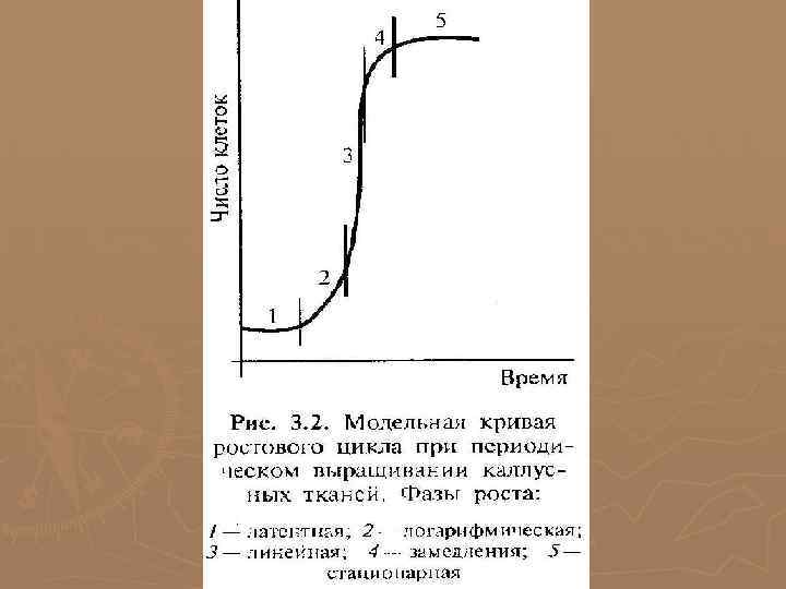 ►Формирование каллуса длится обычно 1 2 месяца. Образовавшийся каллус в асептических условиях разделяют и переносят на свежую питательную среду. ►Пересаженные ткани растут в контролируемых условиях при температуре 24 28°С. Периодичность субкультивирования тканей зависит от скорости роста биомассы. ►Каллусная клетка развивается аналогично другим клеткам, проходя соответственно такие циклы, как деление, растяжение, дифференцировка, старение и отмирание. ►Кривая роста каллусной ткани имеет S образный характер и включает 5 фаз разной длительности у разных растений: 1 − латентная (лаг фаза − клетки адаптируются и готовятся к делению); 2 − линейная (рост каллусной ткани идет с постоянной скоростью); 3 − экспоненциальная (время максимальной митотической активности; рост клетки ускорен, масса каллуса увеличивается); 4 − стационарная (интенсивность деления резко снижается); 5 − отмирания.