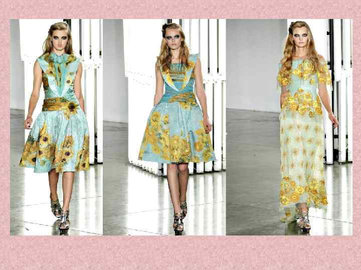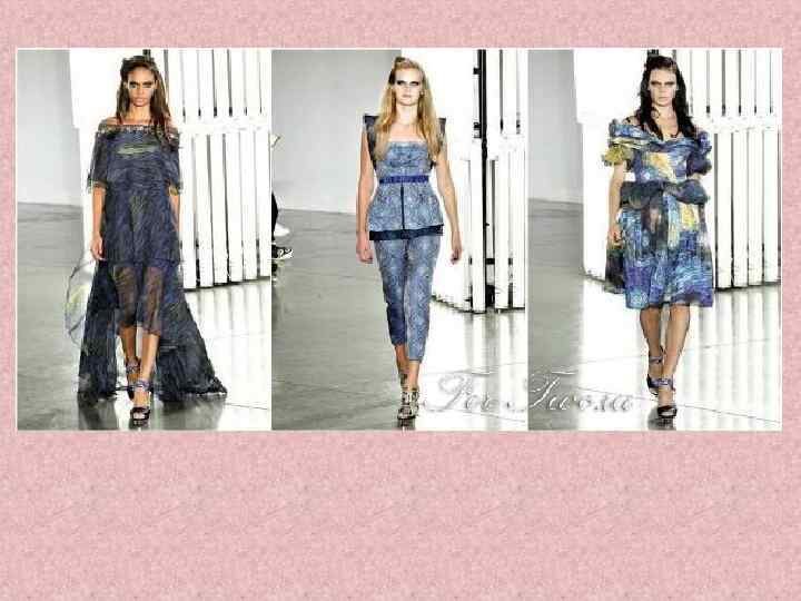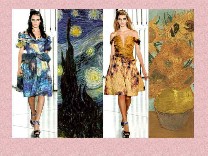 Коллекция, вдохновленная произведениями Винсента Ван Гога. • Сестры Маллеви, дизайнеры Rodarte, создали свою коллекцию на основе картин Ван Гога. Первыми предстали разные интерпретации его знаменитых работ – «Подсолнухи» и «Звездная ночь» .