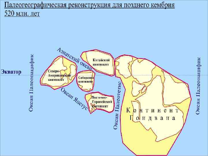 Азиатский океан – имеет сложную конфигурацию и разделяет Северо. Американский, Восточно-Европейский, Сибирский и Китайский континенты. Япетус – разделяет Восточно-Европейский и Северо-Американский континенты.