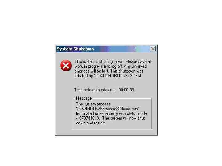 • Другие вредоносные программы специальных сообщений не выводят, но могут провоцировать разного рода сбои в работе компьютера или прикладных программ. Например, одним из признаков попытки проникновения червя Sasser является появление на экране сообщения о сбое в процессе lsass. exe, в результате чего система будет перезагружена