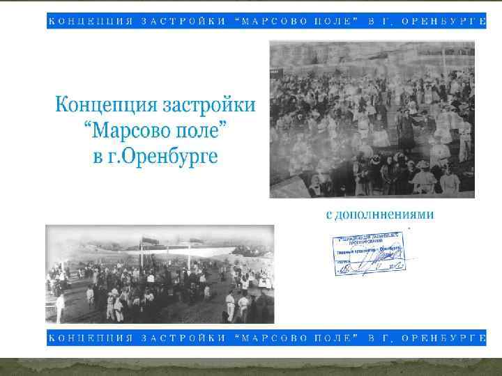В период 1980 -2005 года рассматривались планы восстановления места отдыха горожан в историческом месте – на «Марсово поле» . ВОЗМОЖНО Однако , восстановить «Марсово поле» в прежних границах не представляется возможным. Но восстановить идею, воссоздать дух этого места в Оренбурге