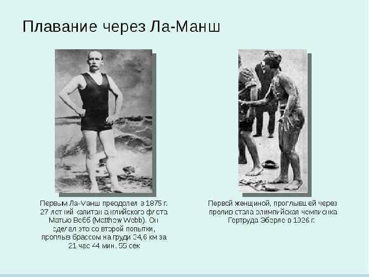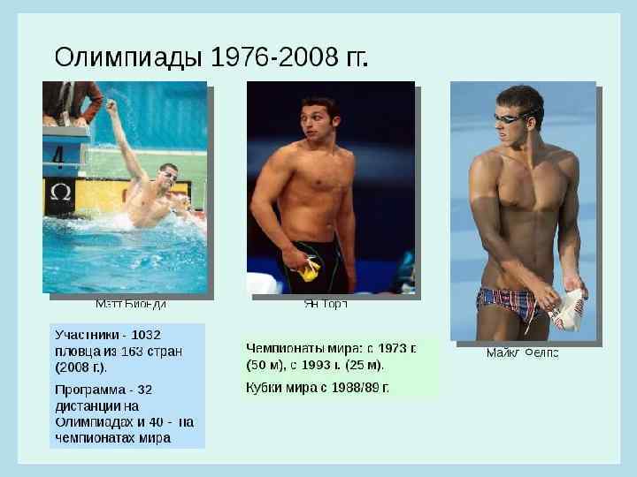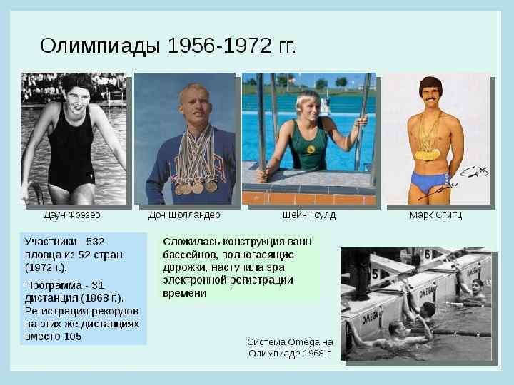 • В 1963 году американец Дон Шоландер стал первым в истории пловцом, которому удалось выплыть из 2 -ух минут на дистанции 200 м вольным стилем. • Первым пловцом, выступившим на соревнованиях в очках, а также в плавательной шапочке, считается англичанин Дэвид Уилки (1970 г. ). • Американский пловец Марк Спитц стал первым человеком в истории, завоевавшим семь золотых олимпийских медалей на одних Играх (Мюнхен, 1972 г. ).