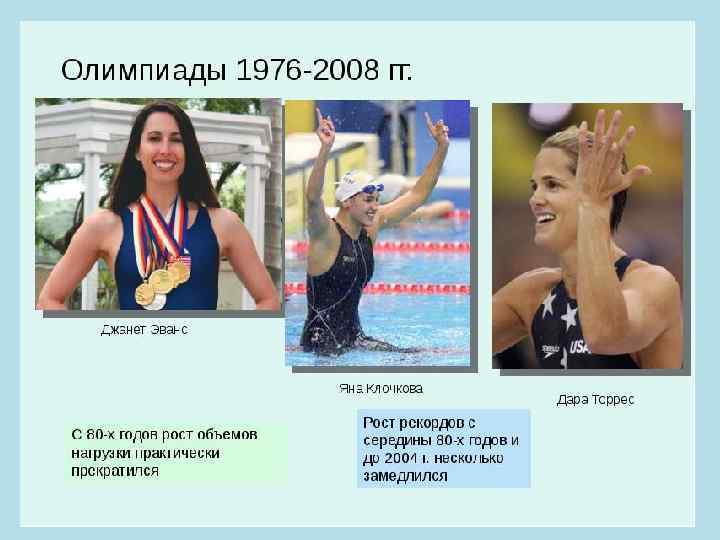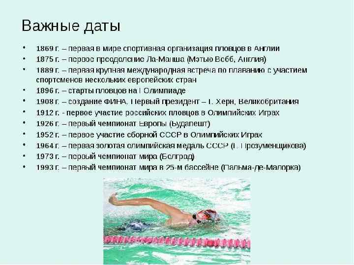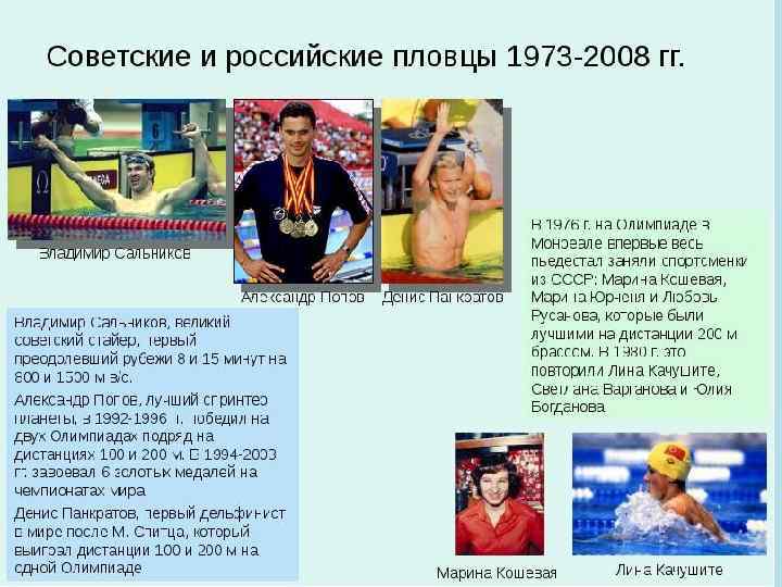 • В 1973 году в Белграде прошел первый чемпионат мира по водным видам спорта. • В 1980 году на Олимпийских играх в Москве знаменитый пловец Владимир Сальников впервые в истории плавания проплыл дистанцию в 1500 м вольным стилем менее чем за 15 мин (14: 58. 27). • Кристин Отто из ГДР завоевала на Олимпиаде 1988 года в Сеуле шесть золотых медалей, и это стало рекордом для женщин по числу золотых медалей завоеванных на одних Олимпийских играх.