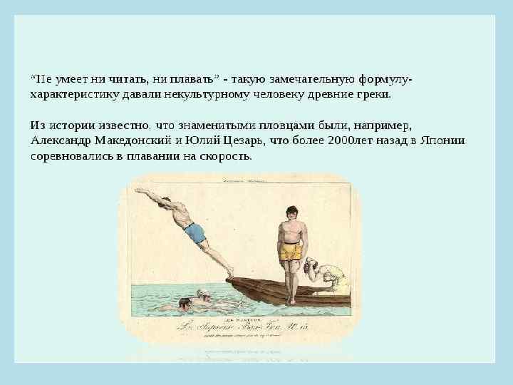 • Еще до нашей эры в Древней Греции плавание использовалось как одно из важнейших средств воспитания молодежи. Об этом свидетельствует один из учебников по истории военного искусства: «В Афинах большое внимание уделялось умственному и физическому развитию. Одинаково считались «хромым» (калекой) как не умеющего читать, так и не умеющего плавать» . Об этом же свидетельствует и известное высказывание древнегреческого историка и философа Платона: «Можно ли людям, которые являются противоположностью мудрого, …плавать и читать не умеют, вверить службу? »