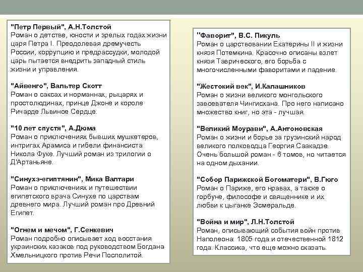 "Петр Первый", А. Н. Толстой Роман о детстве, юности и зрелых годах жизни царя Петра I. Преодолевая дремучесть России, коррупцию и предрассудки, молодой царь пытается внедрить западный стиль жизни и управления. "Фаворит", В. С. Пикуль Роман о царствовании Екатерины II и жизни князя Потемкина. Красочно описаны взлет князя Таврического, его борьба с многочисленными фаворитами и падение. "Айвенго", Вальтер Скотт Роман о саксах и норманнах, рыцарях и простолюдинах, принце Джоне и короле Ричарде Львиное Сердце. "Жестокий век", И. Калашников Роман о жизни великого монгольского завоевателя Чингисхана. Про него написано множество книг, но эта лучшая. "10 лет спустя", А. Дюма Роман о приключениях бывших мушкетеров, интригах Арамиса и гибели финансиста Никола Фуке. Лучший роман из трилогии о Д'Артаньяне. "Великий Моурави", А. Антоновская Роман о жизни и борье за грузинский народ великого полководца Георгия Саакадзе. Очень большой роман 6 томов, но читается на одном дыхании. "Синухэ-египтянин", Мика Валтари Роман о приключениях и путешествии египетского врача Синухе по царствам древнего мира. Лучший роман про Древний Египет. "Собор Парижской Богоматери", В. Гюго Роман о Париже, его нравах, а также о горбуне, философе и священнике и их любви к цыганке Эсмеральде. "Огнем и мечом", Г. Сенкевич Роман подробно описывает ход восстания украинских казаков под руководством Богдана Хмельницкого против Речи Посполитой. "Война и мир", Л. Н. Толстой Роман, описывающий события войн против Наполеона: 1805 года и отечественной 1812 года. Классика, что еще можно сказать.