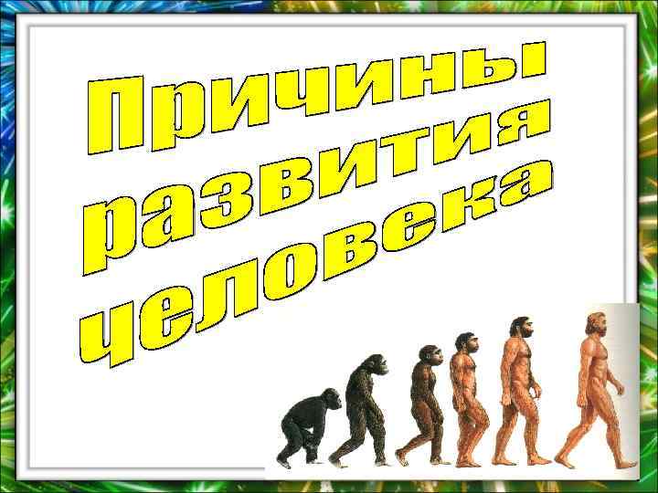 Изменения Причины 7. Изготовление орудий труда Мясная пища, необходимость охотиться 8. Появление речи Коллективная охота, координация действий 9. Одежда, добывание огня Расселение в холодные районы