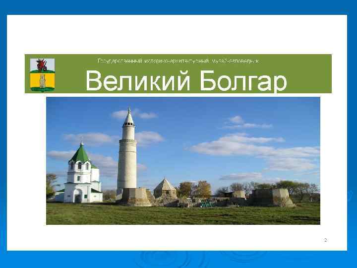 Булгар (Болгар) – один из древнейших городов на территории современного Татарстана. Известно, что самое раннее поселение на месте Булгара относится ко второй половине I-го тыс. н. э. По восточным письменным источникам город известен с X столетия. Теперь мы можем наблюдать только остатки древнего города Булгар – силуэты белокаменных руин. Они виднеются издалека на обрывистом левом берегу могучей реки Волги, в 30 км от впадения в неё реки Камы. Десять столетий тому назад нам открылась бы другая картина.