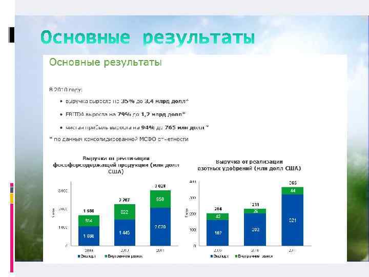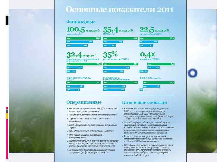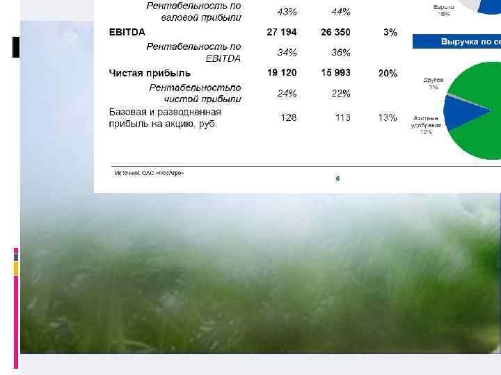 Выручка увеличилась на 8% по сравнению с аналогичным периодом прошлого года до 79 237 млн. руб. Показатель EBITDA за 9 месяцев 2012 г. увеличился на 3% по сравнению с аналогичным периодом прошлого года с 26 350 млн. руб. до 27 194 млн. руб. Рентабельность EBITDA за 9 месяцев 2012 г. составила 34% по сравнению с 36% за 9 месяцев 2011 г. Базовая и разводненная прибыль на акцию составила 128 руб. за 9 месяцев 2012 г. по сравнению с 113 руб. за 9 месяцев 2011 г. Продажи NPK за 9 месяцев 2012 г. выросли по сравнению с аналогичны периодом прошлого года на 60% и достигли рекордного уровня в результате реализации стратегии органического роста с акцентом на гибкость производства и увеличение мощностей Отношение чистого долга к EBITDA в годовом исчислении находится на уровне 0, 29 х, что делает доступным привлечение долгового финансирования для дальнейшего приобретения долей в дочерних производственных компаниях при сохранении комфортного уровня долга Достигнуты существенные успехи по ключевым стратегическим целям, начиная с объединения и консолидации производственных дочерних предприятий и заканчивая ростом производственных мощностей и повышением операционной эффективности