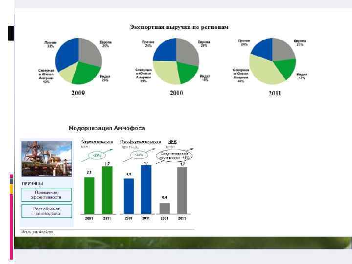 Российский рынок является приоритетным для «Фос. Агро» . В 2010 году на долю России приходилось 35% от общего объема продаж компании (в стоимостном выражении). При этом компания занимала: 52% долю российского рынка моноаммонийфосфата (MAP); 44% долю рынка фосфорсодержащих, комплексных NPK - удобрений. Эти удобрения относятся к числу наиболее популярных у российских производителей сельскохозяйственной продукции. Продукция наших предприятий также экспортируется более чем в 60 стран Юго-Восточной Азии, Латинской Америки и Европы. «Фос. Агро» поддерживает развитую собственную сбытовую сеть в России, стремится укреплять свои позиции на внутреннем рынке и способствует развитию местных производителей сельхозпродукции. Экспортные операции рассматриваются, прежде всего, как возможность расширить сбыт продукции и обеспечить стабильную загрузку растущих производственных мощностей.