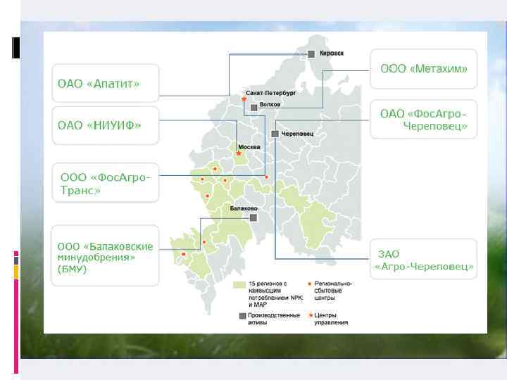 «Фос. Агро» — вертикально-интегрированная компания. Объединяя добычу, переработку, логистику и прикладные исследования, «Фос. Агро» эффективно управляет затратами по всей цепочке создания новой стоимости и получает синергию от инвестиций в развитие каждого из направлений своего бизнеса. Предприятия «Фос. Агро» производят и перерабатывают два основных вида сырья для выпуска минеральных удобрений — апатитовый концентрат и аммиак. Обеспеченность сырьевыми ресурсами и гибкая производственная платформа позволяют быстро переориентировать производство на выпуск того или иного вида удобрений в зависимости от колебаний спроса. Оперативное управление всеми направлениями бизнеса «Фос. Агро» осуществляет ЗАО «Фос. Агро АГ» . Она же управляет производственно-хозяйственной деятельностью предприятий «Фос. Агро» — ОАО «Фос. Агро-Череповец» , ООО «Балаковские минеральные удобрения» , ОАО «Апатит» , ЗАО «Агро. Череповец «, транспортно-экспедиторской компании ООО «Фос. Агро-Транс» .