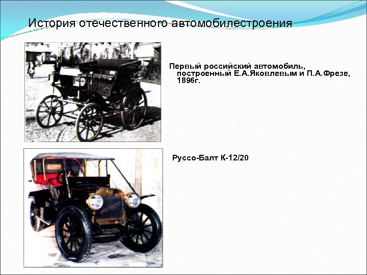 История отечественного автомобилестроения Первый российский автомобиль, построенный Е. А. Яковлевым и П. А. Фрезе, 1896 г. Руссо-Балт К-12/20