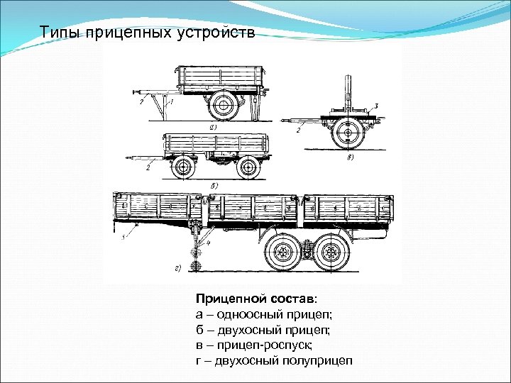Типы прицепных устройств Прицепной состав: а – одноосный прицеп; б – двухосный прицеп; в – прицеп роспуск; г – двухосный полуприцеп