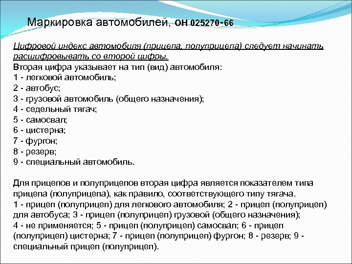 Маркировка автомобилей, ОН 025270‑ 66 Цифровой индекс автомобиля (прицепа, полуприцепа) следует начинать расшифровывать со второй цифры. Вторая цифра указывает на тип (вид) автомобиля: 1 легковой автомобиль; 2 автобус; 3 грузовой автомобиль (общего назначения); 4 седельный тягач; 5 самосвал; 6 цистерна; 7 фургон; 8 резерв; 9 специальный автомобиль. Для прицепов и полуприцепов вторая цифра является показателем типа прицепа (полуприцепа), как правило, соответствующего типу тягача. 1 прицеп (полуприцеп) для легкового автомобиля; 2 прицеп (полуприцеп) для автобуса; 3 прицеп (полуприцеп) грузовой (общего назначения); 4 не применяется; 5 прицеп (полуприцеп) самосвал; 6 прицеп (полуприцеп) цистерна; 7 прицеп (полуприцеп) фургон; 8 резерв; 9 специальный прицеп (полуприцеп).