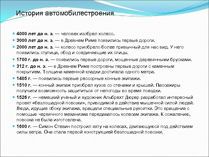 История автомобилестроения 4000 лет до н. э. — человек изобрел колесо. 3000 лет до н. э. — в Древнем Риме появились первые дороги. 2000 лет до н. э. — колесо приобрело более привычный для нас вид. У него появились ступица, обод и соединяющие их спицы. 1700 г. до н. э. — появились первые дороги, мощенные деревянными брусками. 312 г. до н. э. — в Древнем Риме построены первые дороги с каменным покрытием. Толщина каменной кладки достигала одного метра. 1405 г. — появились первые рессорные конные экипажи. 1510 г. — конный экипаж приобрел кузов со стенами и крышей. Пассажиры получили возможность защититься от непогоды во время поездки. 1526 г. — немецкий ученый и художник Альбрехт Дюрер разработал интересный проект «безлошадной повозки» , приводимой в действие мышечной силой людей. Люди, идущие сбоку экипажа, вращали специальные рукоятки. Это вращение с помощью червячного механизма передавалось колесам экипажа. К сожалению, повозка не была изготовлена. 1600 г. — Симон Стевин построил яхту на колесах, двигающуюся под действием силы ветра. Она стала первой конструкцией безлошадной повозки.