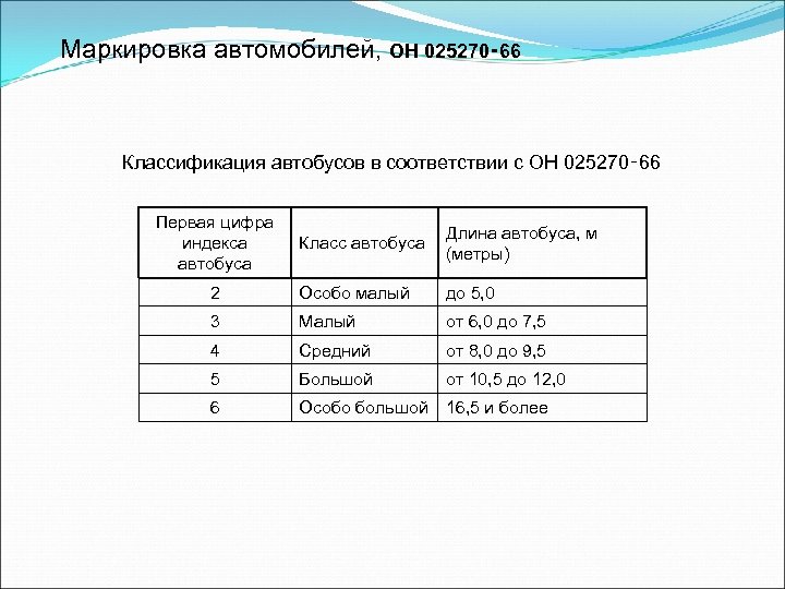 Маркировка автомобилей, ОН 025270‑ 66 Классификация автобусов в соответствии с ОН 025270‑ 66 Первая цифра индекса автобуса Класс автобуса Длина автобуса, м (метры) 2 Особо малый до 5, 0 3 Малый от 6, 0 до 7, 5 4 Средний от 8, 0 до 9, 5 5 Большой от 10, 5 до 12, 0 6 Особо большой 16, 5 и более