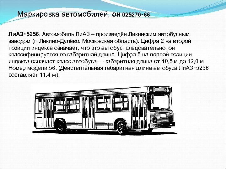Маркировка автомобилей, ОН 025270‑ 66 Ли. АЗ‑ 5256. Автомобиль Ли. АЗ – произведён Ликинским автобусным заводом (г. Ликино Дулёво, Московская область). Цифра 2 на второй позиции индекса означает, что это автобус, следовательно, он классифицируется по габаритной длине. Цифра 5 на первой позиции индекса означает класс автобуса — габаритная длина от 10, 5 м до 12, 0 м. Номер модели 56. (Действительная габаритная длина автобуса Ли. АЗ‑ 5256 составляет 11, 4 м).