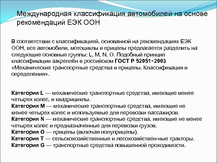 Международная классификация автомобилей на основе рекомендаций ЕЭК ООН В соответствии с классификацией, основанной на рекомендациях ЕЭК ООН, все автомобили, мотоциклы и прицепы предлагается разделить на следующие основные группы: L, M, N, O. Подобный принцип классификации закреплён в российском ГОСТ Р 52051‑ 2003 «Механические транспортные средства и прицепы. Классификация и определения» . Категория L — механические транспортные средства, имеющие менее четырех колес, и квадрициклы. Категория М — механические транспортные средства, имеющие не менее четырех колес и используемые для перевозки пассажиров. Категория N — механические транспортные средства, имеющие не менее четырех колес и предназначенные для перевозки грузов. Категория О — прицепы (включая полуприцепы). Категория T — сельскохозяйственные и лесохозяйствен ные тракторы. Категория G — транспортные средства повышенной проходимости.