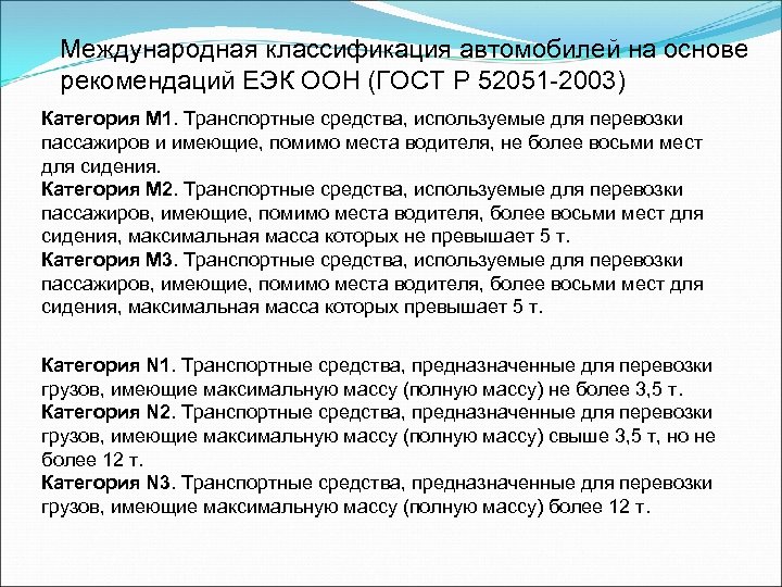 Международная классификация автомобилей на основе рекомендаций ЕЭК ООН (ГОСТ Р 52051 2003) Категория М 1. Транспортные средства, используемые для перевозки пассажиров и имеющие, помимо места водителя, не более восьми мест для сидения. Категория М 2. Транспортные средства, используемые для перевозки пассажиров, имеющие, помимо места водителя, более восьми мест для сидения, максимальная масса которых не превышает 5 т. Категория М 3. Транспортные средства, используемые для перевозки пассажиров, имеющие, помимо места водителя, более восьми мест для сидения, максимальная масса которых превышает 5 т. Категория N 1. Транспортные средства, предназначенные для перевозки грузов, имеющие максимальную массу (полную массу) не более 3, 5 т. Категория N 2. Транспортные средства, предназначенные для перевозки грузов, имеющие максимальную массу (полную массу) свыше 3, 5 т, но не более 12 т. Категория N 3. Транспортные средства, предназначенные для перевозки грузов, имеющие максимальную массу (полную массу) более 12 т.
