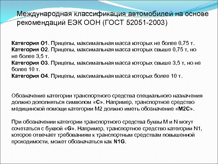 Международная классификация автомобилей на основе рекомендаций ЕЭК ООН (ГОСТ 52051 2003) Категория O 1. Прицепы, максимальная масса которых не более 0, 75 т. Категория О 2. Прицепы, максимальная масса которых свыше 0, 75 т, но не более 3, 5 т. Категория О 3. Прицепы, максимальная масса которых свыше 3, 5 т, но не более 10 т. Категория О 4. Прицепы, максимальная масса которых более 10 т. Обозначение категории транспортного средства специального назначения должно дополняться символом «C» . Например, транспортное средство медицинской помощи категории М 2 должно иметь обозначение «М 2 С» . При обозначении категории транспортного средства буквы М и N могут сочетаться с буквой «G» . Например, транспортное средство категории N 1, которое отвечает требованиям к транспортным средствам повышенной проходимости, может обозначаться как N 1 G.
