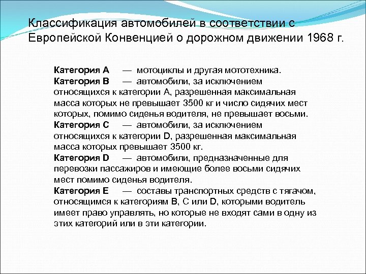 Классификация автомобилей в соответствии с Европейской Конвенцией о дорожном движении 1968 г. Категория A — мотоциклы и другая мототехника. Категория B — автомобили, за исключением относящихся к категории A, разрешенная максимальная масса которых не превышает 3500 кг и число сидячих мест которых, помимо сиденья водителя, не превышает восьми. Категория C — автомобили, за исключением относящихся к категории D, разрешенная максимальная масса которых превышает 3500 кг. Категория D — автомобили, предназначенные для перевозки пассажиров и имеющие более восьми сидячих мест помимо сиденья водителя. Категория E — составы транспортных средств с тягачом, относящимся к категориям B, C или D, которыми водитель имеет право управлять, но которые не входят сами в одну из этих категорий или в эти категории.