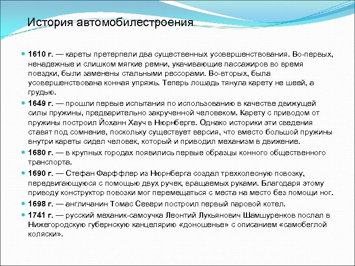 История автомобилестроения 1610 г. — кареты претерпели два существенных усовершенствования. Во первых, ненадежные и слишком мягкие ремни, укачивающие пассажиров во время поездки, были заменены стальными рессорами. Во вторых, была усовершенствована конная упряжь. Теперь лошадь тянула карету не шеей, а грудью. 1649 г. — прошли первые испытания по использованию в качестве движущей силы пружины, предварительно закрученной человеком. Карету с приводом от пружины построил Йоханн Хауч в Нюрнберге. Однако историки эти сведения ставят под сомнение, поскольку существует версия, что вместо большой пружины внутри кареты сидел человек, который и приводил механизм в движение. 1680 г. — в крупных городах появились первые образцы конного общественного транспорта. 1690 г. — Стефан Фарффлер из Нюрнберга создал трехколесную повозку, передвигающуюся с помощью двух ручек, вращаемых руками. Благодаря этому приводу конструктор повозки мог перемещаться с места на место без помощи ног. 1698 г. — англичанин Томас Севери построил первый паровой котел. 1741 г. — русский механик самоучка Леонтий Лукьянович Шамшуренков послал в Нижегородскую губернскую канцелярию «доношенье» с описанием «самобеглой коляски» .