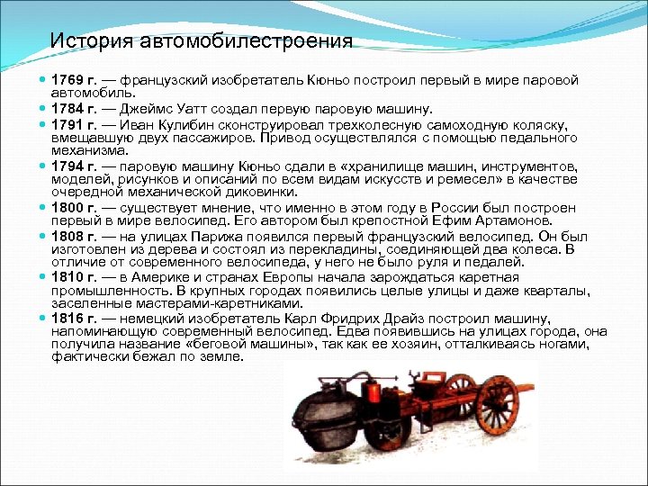 История автомобилестроения 1769 г. — французский изобретатель Кюньо построил первый в мире паровой автомобиль. 1784 г. — Джеймс Уатт создал первую паровую машину. 1791 г. — Иван Кулибин сконструировал трехколесную самоходную коляску, вмещавшую двух пассажиров. Привод осуществлялся с помощью педального механизма. 1794 г. — паровую машину Кюньо сдали в «хранилище машин, инструментов, моделей, рисунков и описаний по всем видам искусств и ремесел» в качестве очередной механической диковинки. 1800 г. — существует мнение, что именно в этом году в России был построен первый в мире велосипед. Его автором был крепостной Ефим Артамонов. 1808 г. — на улицах Парижа появился первый французский велосипед. Он был изготовлен из дерева и состоял из перекладины, соединяющей два колеса. В отличие от современного велосипеда, у него не было руля и педалей. 1810 г. — в Америке и странах Европы начала зарождаться каретная промышленность. В крупных городах появились целые улицы и даже кварталы, заселенные мастерами каретниками. 1816 г. — немецкий изобретатель Карл Фридрих Драйз построил машину, напоминающую современный велосипед. Едва появившись на улицах города, она получила название «беговой машины» , так как ее хозяин, отталкиваясь ногами, фактически бежал по земле.
