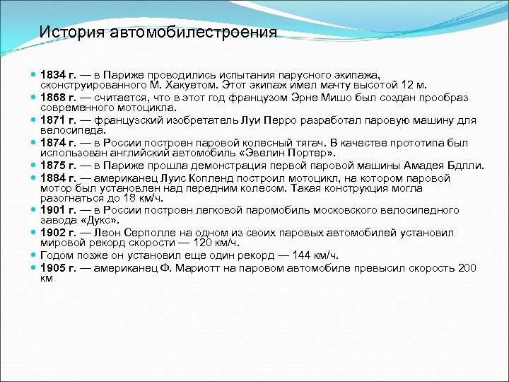 История автомобилестроения 1834 г. — в Париже проводились испытания парусного экипажа, сконструированного М. Хакуетом. Этот экипаж имел мачту высотой 12 м. 1868 г. — считается, что в этот год французом Эрне Мишо был создан прообраз современного мотоцикла. 1871 г. — французский изобретатель Луи Перро разработал паровую машину для велосипеда. 1874 г. — в России построен паровой колесный тягач. В качестве прототипа был использован английский автомобиль «Эвелин Портер» . 1875 г. — в Париже прошла демонстрация первой паровой машины Амадея Бдлли. 1884 г. — американец Луис Копленд построил мотоцикл, на котором паровой мотор был установлен над передним колесом. Такая конструкция могла разогнаться до 18 км/ч. 1901 г. — в России построен легковой паромобиль московского велосипедного завода «Дукс» . 1902 г. — Леон Серполле на одном из своих паровых автомобилей установил мировой рекорд скорости — 120 км/ч. Годом позже он установил еще один рекорд — 144 км/ч. 1905 г. — американец Ф. Мариотт на паровом автомобиле превысил скорость 200 км