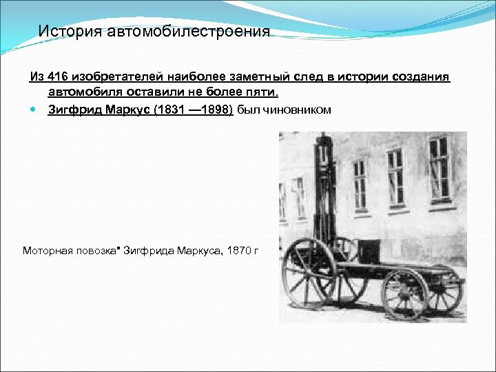История автомобилестроения Из 416 изобретателей наиболее заметный след в истории создания автомобиля оставили не более пяти. Зигфрид Маркус (1831 — 1898) был чиновником Моторная повозка" Зигфрида Маркуса, 1870 г