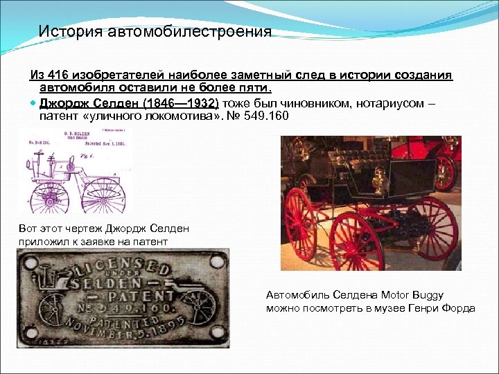 История автомобилестроения Из 416 изобретателей наиболее заметный след в истории создания автомобиля оставили не более пяти. Джордж Селден (1846— 1932) тоже был чиновником, нотариусом – патент «уличного локомотива» . № 549. 160 Вот этот чертеж Джордж Селден приложил к заявке на патент Автомобиль Селдена Motor Buggy можно посмотреть в музее Генри Форда