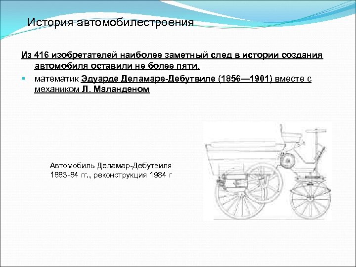 История автомобилестроения Из 416 изобретателей наиболее заметный след в истории создания автомобиля оставили не более пяти. § математик Эдуарде Деламаре-Дебутвиле (1856— 1901) вместе с механиком Л. Маланденом Автомобиль Деламар Дебутвиля 1883 84 гг. , реконструкция 1984 г