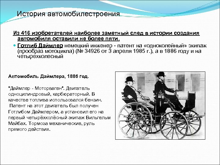 История автомобилестроения Из 416 изобретателей наиболее заметный след в истории создания автомобиля оставили не более пяти. Готлиб Даймлер немецкий инженер патент на «одноколейный» экипаж (прообраз мотоцикла) (№ 34926 от 3 апреля 1985 г. ), а в 1886 году и на четырехколесный Автомобиль Даймлера, 1886 год. "Даймлер Моторваген". Двигатель одноцилиндровый, карбюраторный. В качестве топлива использовался бензин. Патент на этот двигатель был получен Готлибом Даймлером, а установил его на первый четырёхколёсный экипаж Вильгельм Майбах. Тормоза механические, руль прямого действия.