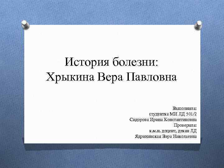 История болезни: Хрыкина Вера Павловна Выполнила: студентка МИ ЛД 501/2 Сидорова Ирина Константиновна Проверила: к. м. н. доцент, декан ЛД Ядрихинская Вера Николаевна