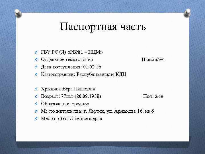 Паспортная часть O ГБУ РС (Я) «РБ№ 1 – НЦМ» O Отделение гематологии Палата№ 4 O Дата поступления: 01. 02. 16 O Кем направлен: Республиканские КДЦ O Хрыкина Вера Павловна O Возраст: 77 лет (20. 09. 1938) Пол: жен O Образование: среднее O Место жительства: г. Якутск, ул. Аржакова 16, кв 6 O Место работы: пенсионерка